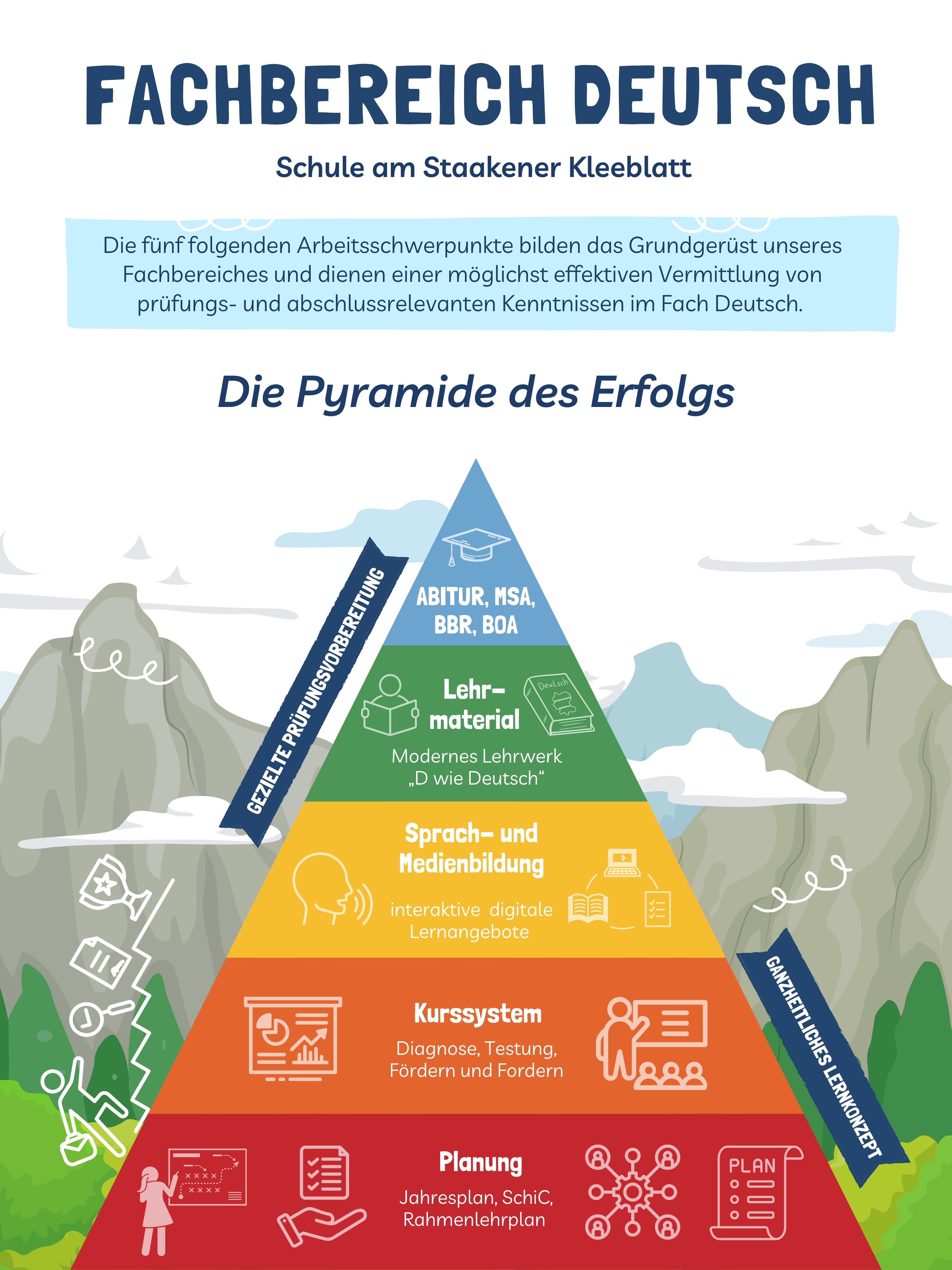 Der Fachbereich Deutsch an unserer Schule ist darauf ausgerichtet, die sprachlichen und methodischen Kompetenzen unserer Schülerinnen und Schüler zu fördern und zu stärken. Unsere Arbeitsschwerpunkte liegen in der Vermittlung von umfassenden Kenntnissen der deutschen Sprache, Literatur und Kultur. Dabei legen wir großen Wert auf das analytische und kreative Schreiben, die Interpretation literarischer Werke sowie die Förderung der mündlichen Ausdrucksfähigkeit. Unsere Philosophie basiert auf einer ganzheitlichen Bildung, die sowohl kognitive als auch soziale und emotionale Aspekte berücksichtigt. Wir streben danach, die Freude am Lesen und Schreiben zu wecken und die kritische Auseinandersetzung mit Texten zu fördern. Unser Ziel ist es, die Schülerinnen und Schüler mithilfe von handlungsorientierten, kreativen und produktiven Aufgabenformaten zu eigenständigem Denken und Handeln zu befähigen und sie auf ihrem Weg zu mündigen und verantwortungsvollen Mitgliedern der Gesellschaft zu begleiten.