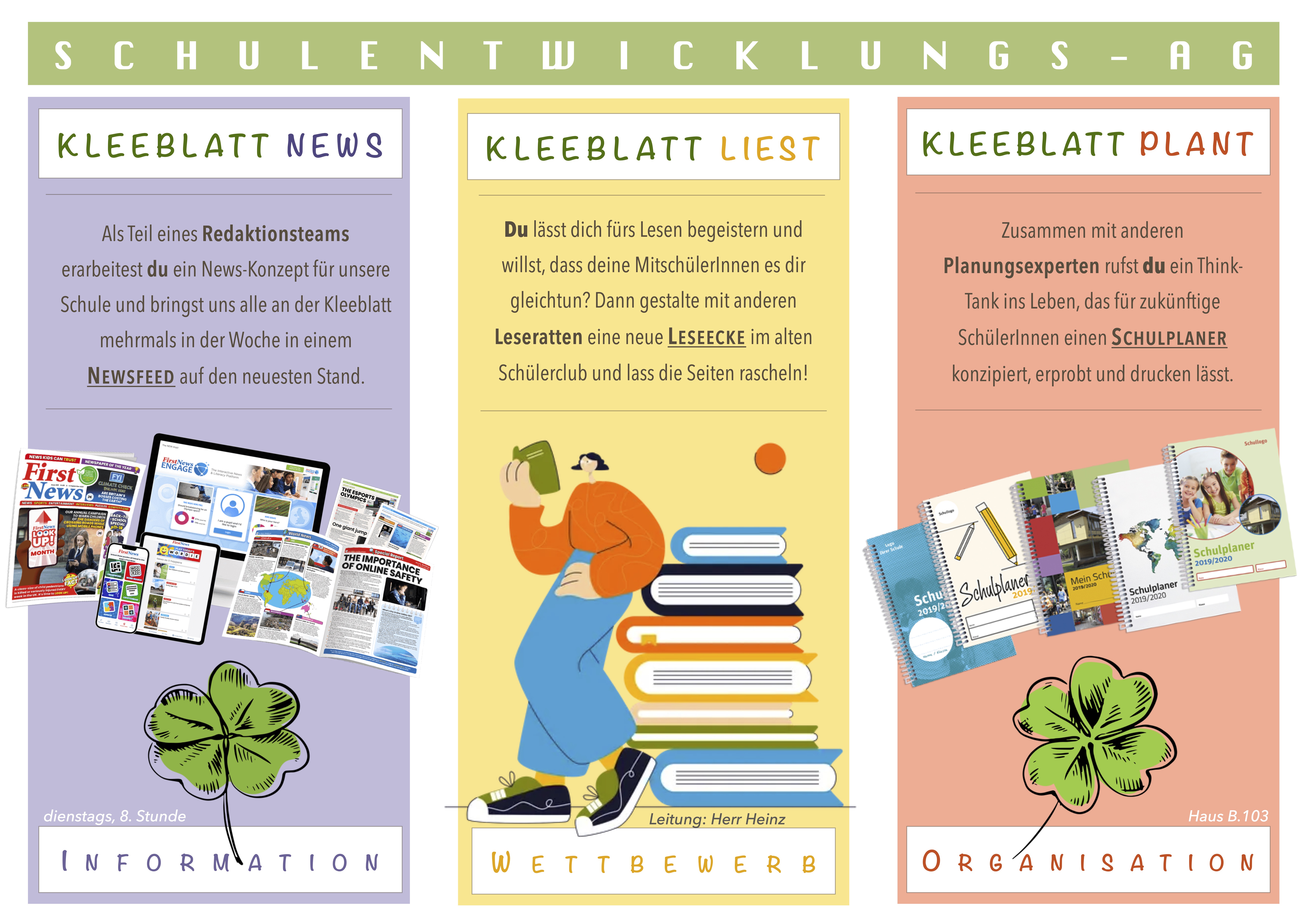 Schnell fanden sich engagierte Schülerinnen und Schüler mit kreativen Ideen, denen die Weiterentwicklung unserer Schule am Herzen lag. Von Anfang an konzentrierten wir uns auf die erste Säule der AG: die „Kleeblatt News“. Hier eigneten wir uns die Grundlagen des journalistischen Arbeitens an – und legten direkt los.