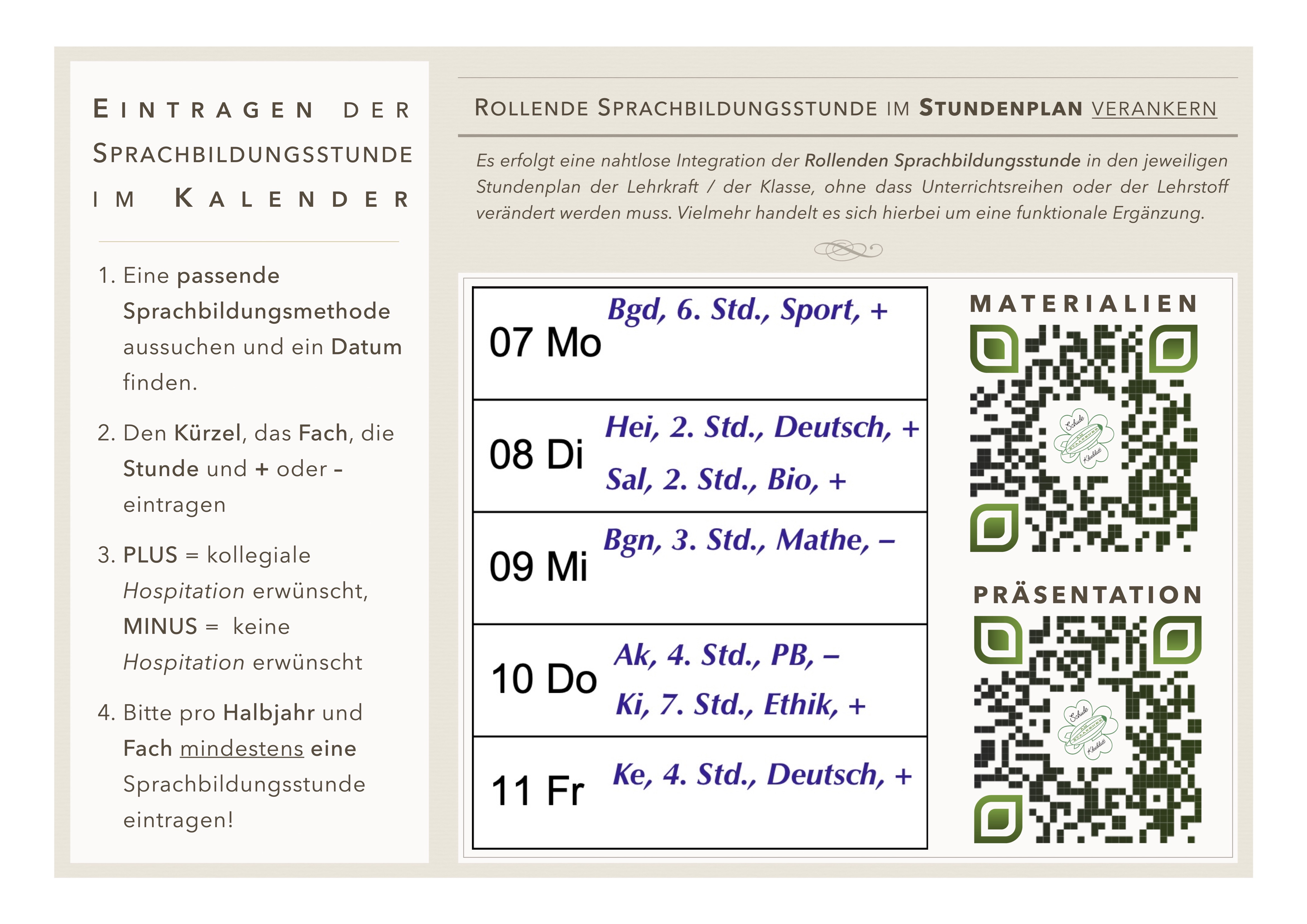 Um Qualität und Nachhaltigkeit zu sichern, hat die Gesamtkonferenz beschlossen, dass jede Lehrkraft pro Schuljahr mindestens zwei Sprachbildungsstunden durchführt. Eine davon wird schriftlich dokumentiert, zusätzlich können kollegiale Hospitationen stattfinden. Dieser Austausch stärkt insbesondere neue Kollegen und Referendare.